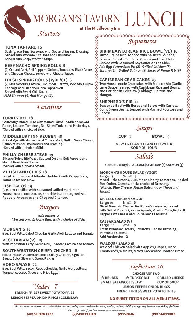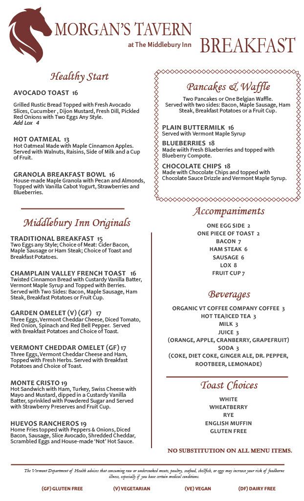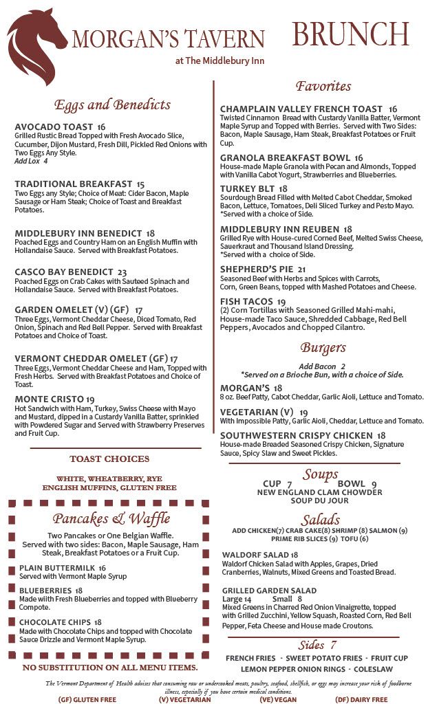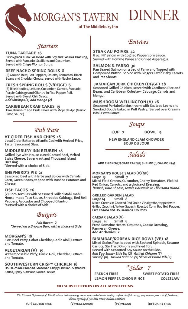 For Morgan’s Tavern, we acquire the freshest ingredients from Vermont producers and purveyors through the Vermont Fresh Network Partnership every day. Our philosophy is that fresh is always best. All of our food is cooked with the guest’s satisfaction in mind, to create a truly memorable and satisfying dining experience.
